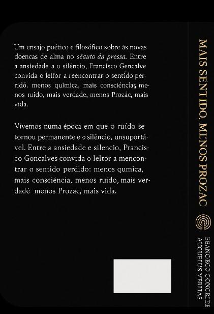 Mais Sentido, Menos Prozac não é um manual de autoajuda, mas um guia de reflexão profunda sobre as doenças invisíveis da alma moderna — a ansiedade, a solidão, o cansaço e o ruído. Inspirado na tradição dos filósofos que viam o pensamento como cura — de Sócrates a Sêneca, de Epicteto a Lou Marinoff — o livro propõe um novo humanismo: a filosofia como terapêutica existencial.